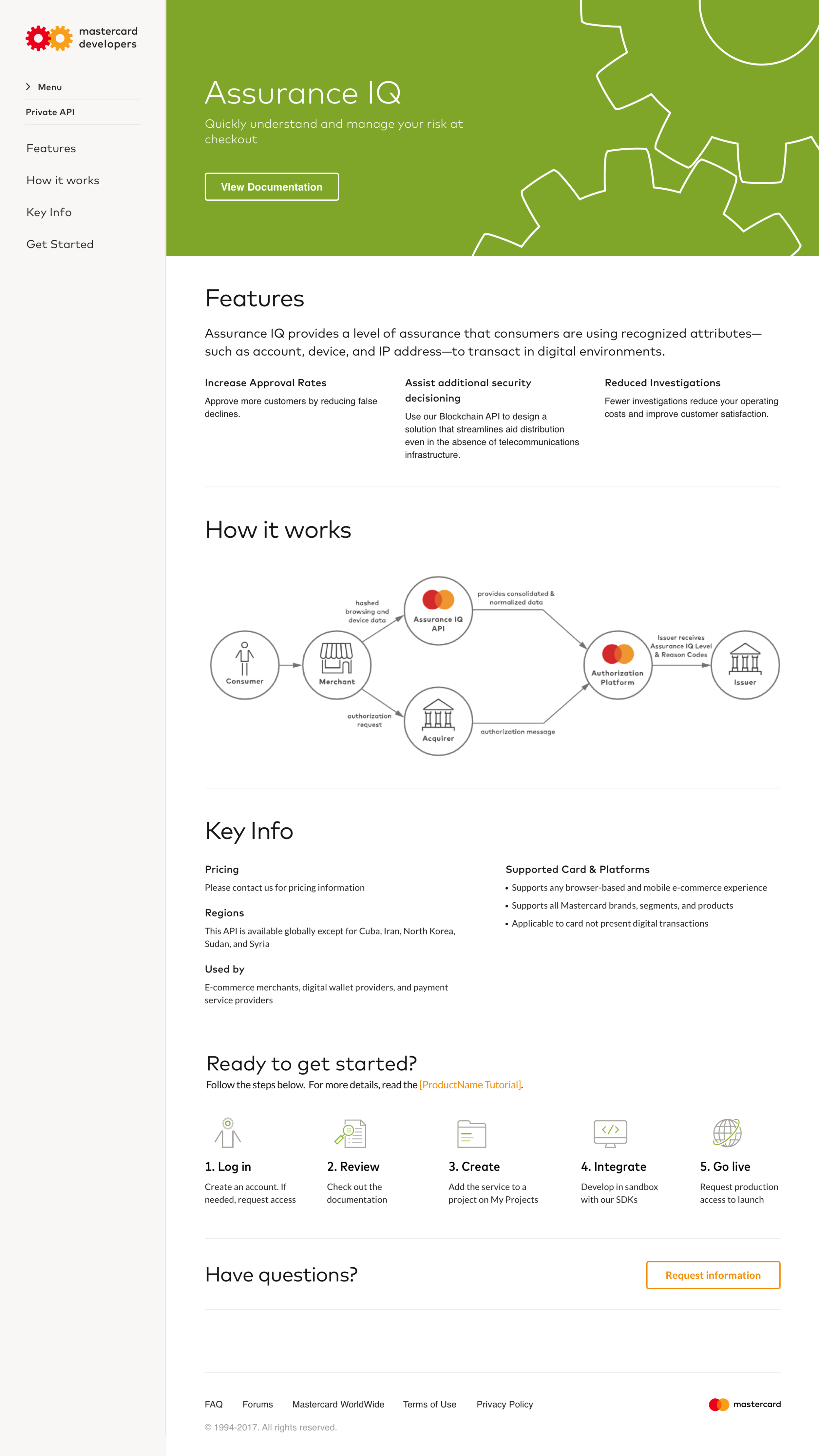Over the past years as a user experience designer at Mastercard, there were many projects I was a part of. Mastercard Developers is Mastercard's OpenAPI site with APIs created and powered by Mastercard. Users of the site range from merchants to service providers to independent developers. The site can be found on developers.mastercard.com.